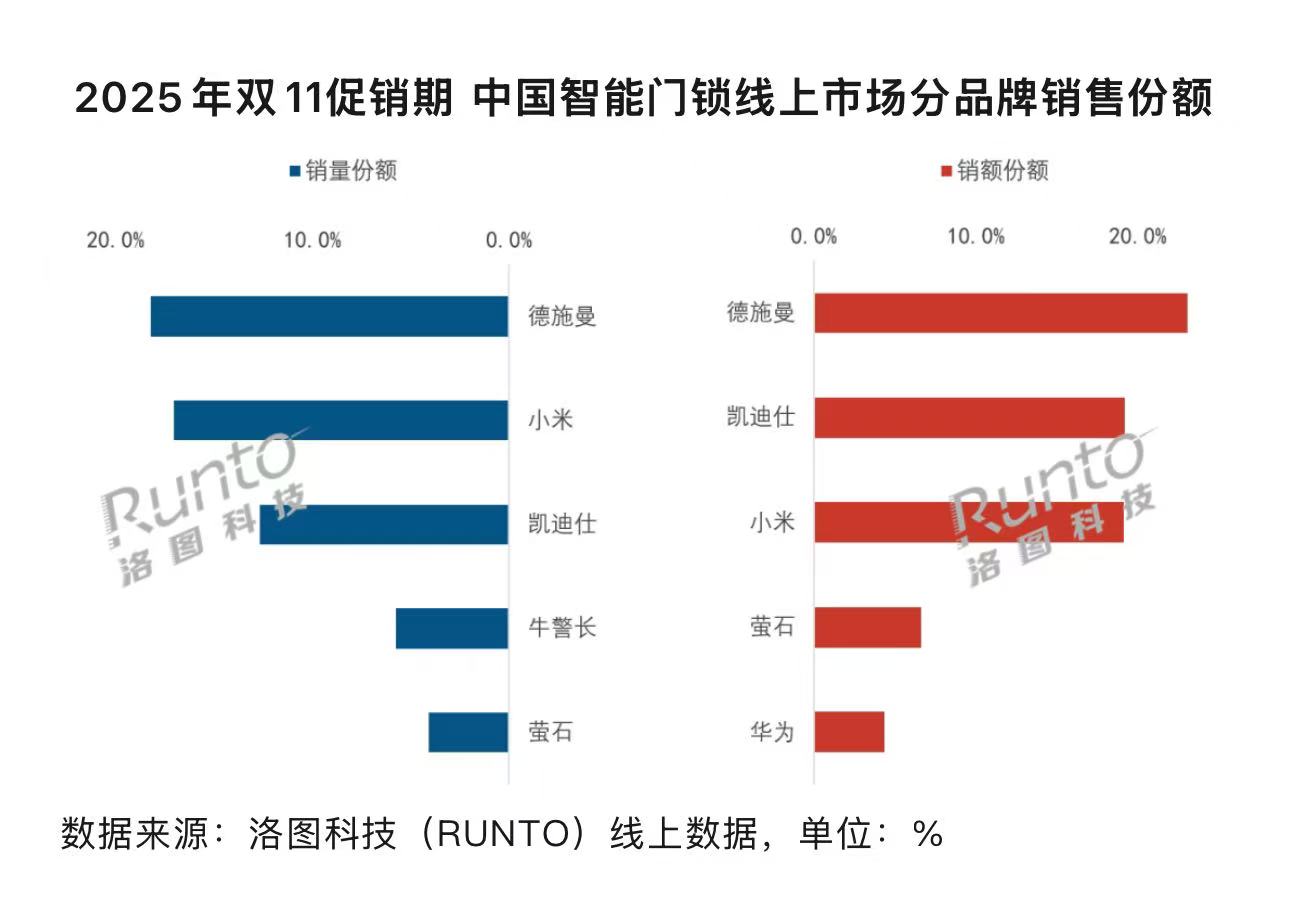 洛图科技报告指出,德施曼位列线上商场的销额与销量双维度第一,销额份额达23.0%。产物层次上,德施曼聚焦中高端商场,双11时期在2000元以上的价钱段竣事了销量与销额的双第一。